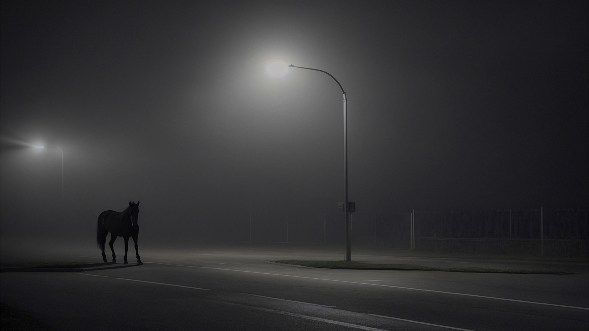 The dark horse standing on the road brings to my mind many thoughts. I think about the modern landscape of the automobile and how the horse appears shadowed as a ghost wandering alone like a lost remnant of an earlier time. It makes me fear all of nature’s creations will disappear as we continue to excavate and build and partition this planet into a world entirely for ourselves. A world in which our technological prowess might one day render nature itself as obsolete as a horse on a road.